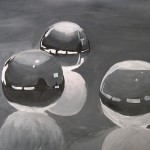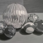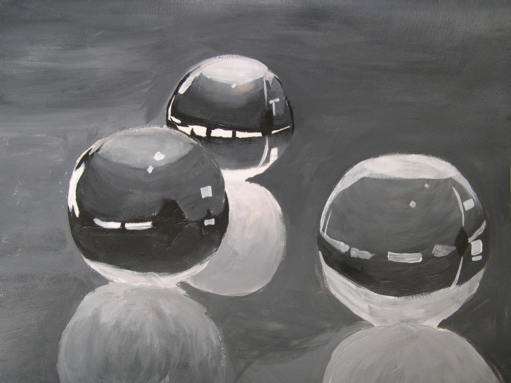 Instructions: Arrange the spheres on a table under a direct light source which comes from one direction. Using your viewfinder, compose an arrangement that makes good use of all negative and positive shapes, including shadows. You may sketch out the composition in pencil first if you find it necessary. Lay out some black and white acrylic on your palette and mix a selection of greys which match the colors in your still-life. Using the greyscale chart on your color wheel, begin to match each area of color with an equivalent grey value. Lay down patches of paint in a series of small brushstrokes. If possible, try not to blend the character of the brushstokes away. This will make the texture of the painting more interesting (more painterly). Try to put down a stroke of paint and leave it alone.