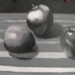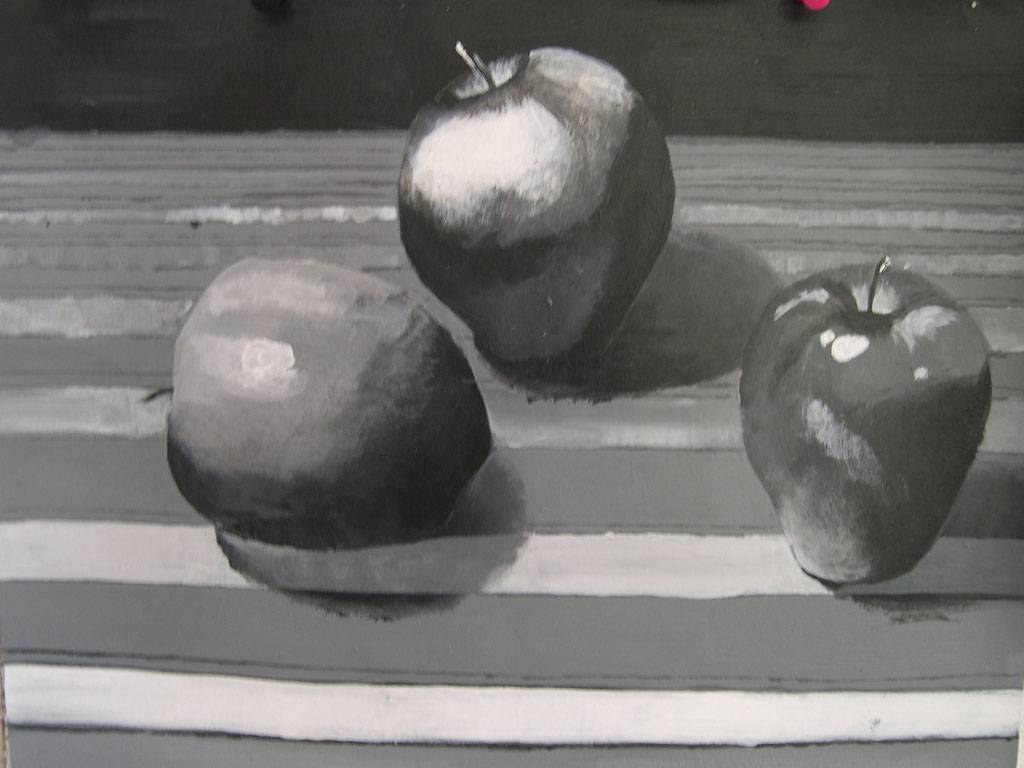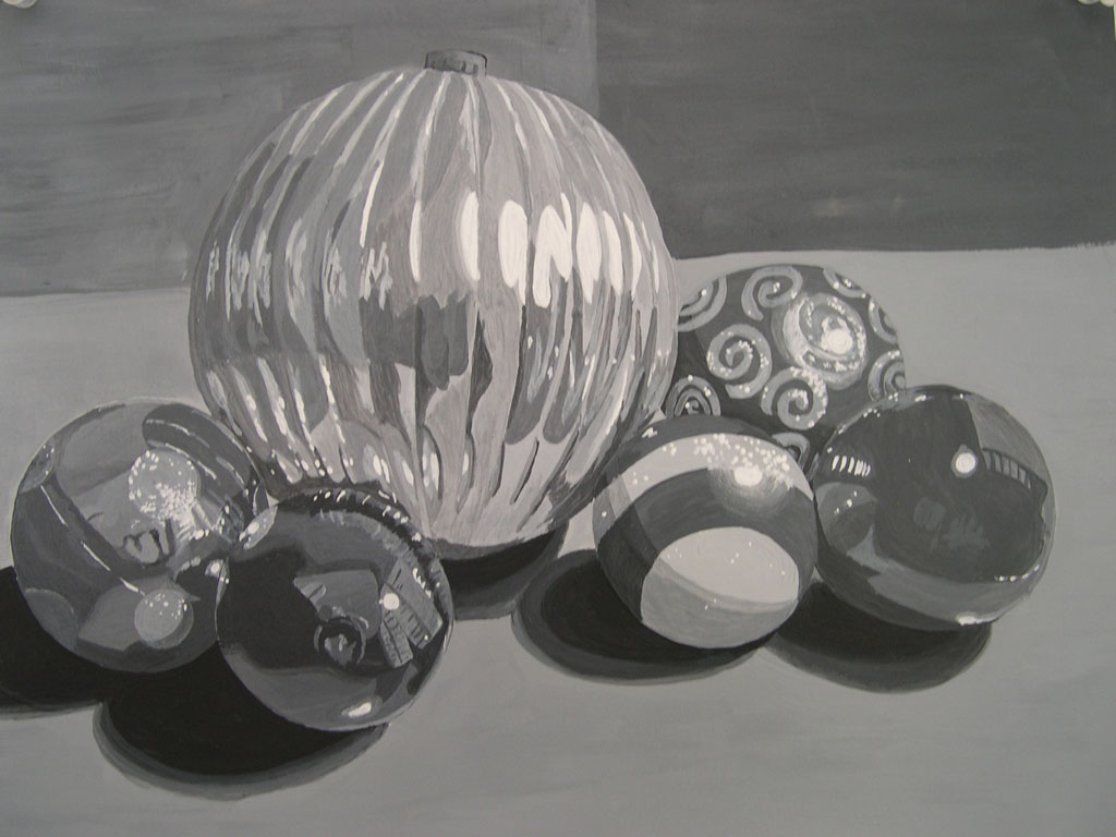 Objectives: 1.) To compose an interesting and balanced composition with 3 spheres. 2.) To create the illusion of volume with light and shadow. 3.) To practice the translation of color into greyscale values. 4. To learn to mix colors and apply paintstrokes without blending.