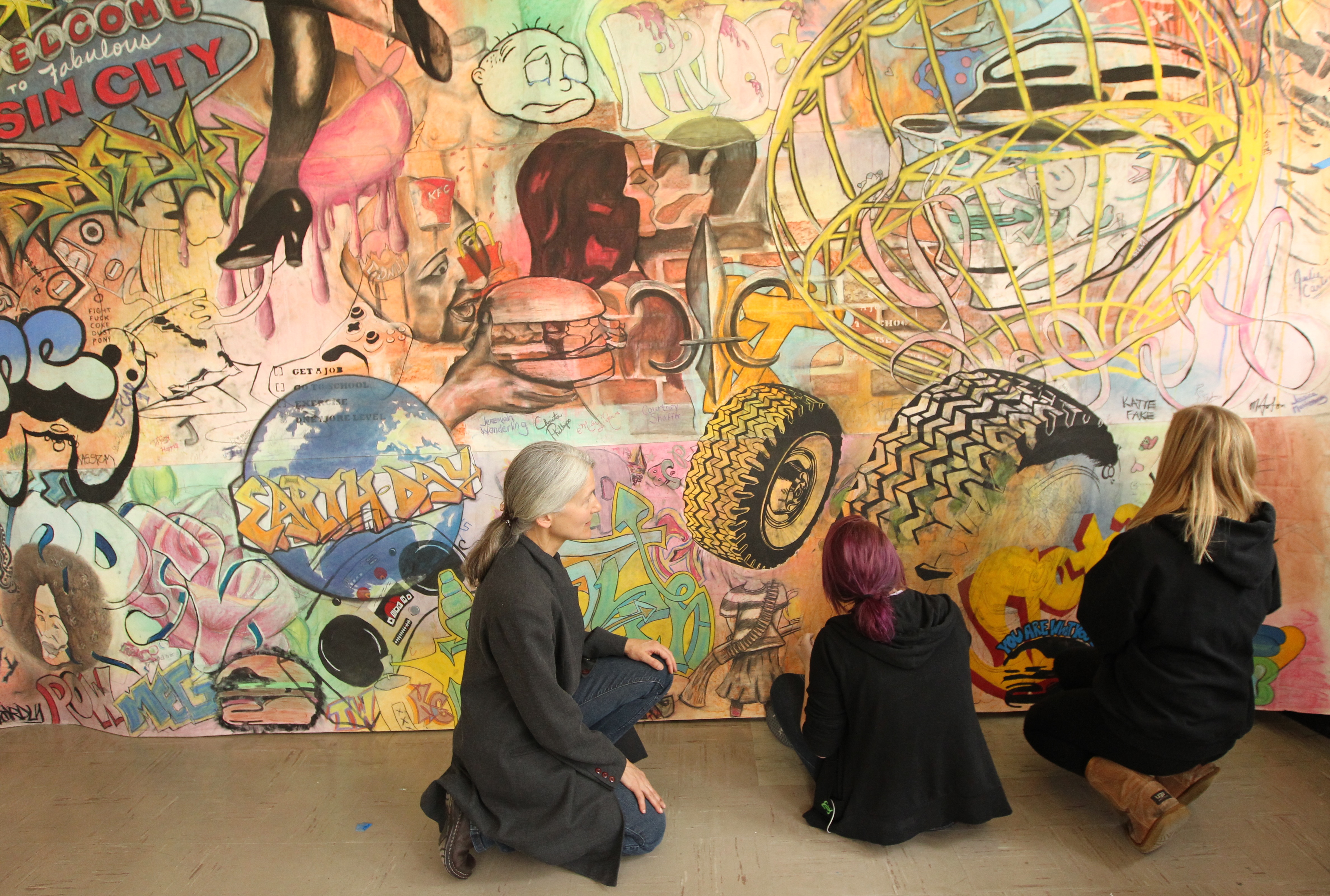 Cal U Student Emma Patarcity (left) and Lydia Karlheim (right) listen to Faculty member Maggie Aston (far left) works to finish the Hip-Hop mural April 2012.